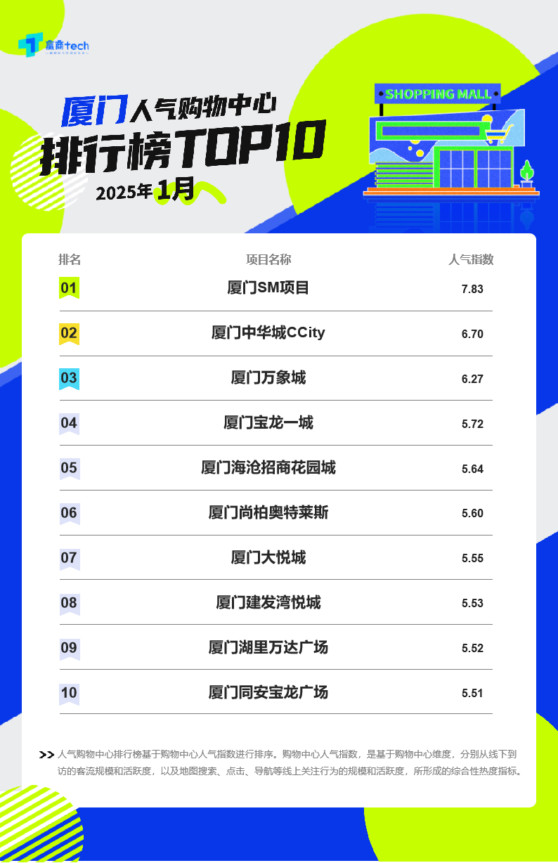 从榜单中厦门上榜项目客流规模区间分布图来看,我市近50%的项目场日均客流在5万人以下;场日均客流5万人—10万人的项目占比达到近30%;而场日均客流10万人以上的超高人气商业项目占比超20%。厦门SM商业城无疑是“显眼包”它以7.83的超高人气指数跻身320个购物中心的第14位,几乎与北京朝阳合生汇(7.95)、上海环贸iapm(7.9)等国内顶尖商业巨头平分秋色,甚至超越了成都IFS(7.64)、成都太古里(7.13)等知名商场,商业影响力不容小觑。今年除夕至正月初六,SM商业城累计客流达119.5万人次,2024年12月31日跨年夜,客流量更是达到30万人次。SM商业城一、二、三期相互贯通,构成“城中城”,截至2024年,已有400多家商户入驻,其中餐饮品牌就达到130多家,丰富的业态组合满足了消费者多样化的需求。此外,SM商业城还是厦门“首店经济”的重要推动者。2024年,SM商业城引入众多首店品牌,进一步提升了商场的时尚感和潮流度。同时,通过举办国际知名动漫IP展览,开展潮流音乐节、街舞大赛等活动,吸引了大量年轻消费群体,增强了消费者的黏性和活跃度。业内人士分析,随着SM四期工程以及洲际酒店集团旗下voco在福建首家酒店的加入,厦门SM项目将进阶为超级商业综合体,未来人气指数有望更上一层楼。成都万象城(6.33)等不过,针对这一评分,也有不少业内人士认为,定位高端的厦门万象城主要优势在于一线品牌的吸附力、群体购买力,而非单纯即时人流量,这样的人气指数从商场的综合维度来看,表现已是不错。
