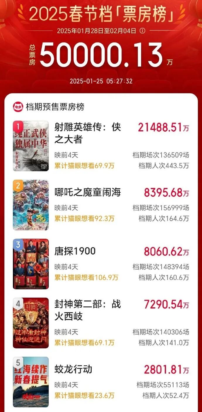 在春节档前夕,电影市场持续火热!据猫眼专业版数据,1月25日5时27分2025春节档票房预售破5亿元!《射雕英雄传:侠之大者》《哪吒之魔童闹海》《唐探1900》分列春节档预售票房榜前三位。近日,2025年春节档电影片单发布会宣布《封神第二部:战火西岐》《哪吒之魔童闹海》《射雕英雄:侠之大者》等六部春节档电影将于大年初一精彩亮相,这也给市民带来更多观影选择。今日,记者走访我市部分影院看到,上述春节档影片海报已在影院售票处前进行展示宣传。同时,我市各大影院目前已做好排片计划,以保障市民春节期间观影体验。上述影片题材多元、类型丰富、主创阵容强大、市场关注度高。