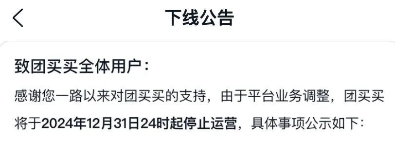 据介绍,团买买是美团官方推出的一款为私域交易提供解决方案的微信社群经营工具。团长可以在团买买上找到全品类商品,开团后可以在朋友圈与微信群内传播分享。感谢您一路以来对团买买的支持,由于平台业务调整,团买买将于2024年12月31日24时起停止运营,具体事项公示如下:自2024年12月31日24时起,您将不能再下单购买商品。如还有未发货的订单,请您在不晚于2025年1月31日24时前与团长沟通协商是否仍正常发货,或发起退款申请。您的账号中未使用的优惠券和津贴,系统将自动于2024年 12月31日24时自动失效处理,不予补发。您的钱包账户如有可提现余额,请您在不晚于2025年2月 28日24时前完成提现,逾期将无法提现且不予补偿。基于用户履约以及售后处理情况,系统可能会限制部分团长账户资金的提现功能,直至妥善处理用户订单,系统将于 2025年1月31日24时解除对应限制。自2025年2月28日24时起,团买买所有小程序将停止全部服务。届时,您将无法登录已注册的团买买账号。我们会按照相关法律法规要求及平台规则约定,妥善且安全的处理好您的个人信息。感恩过往对团买买交付信任的用户和合作伙伴,也请大家持续关注美团生态中其他的生意机会,在“帮大家吃得更好,生活更好”的使命引领下美团会努力为消费者和商家持续创造价值。